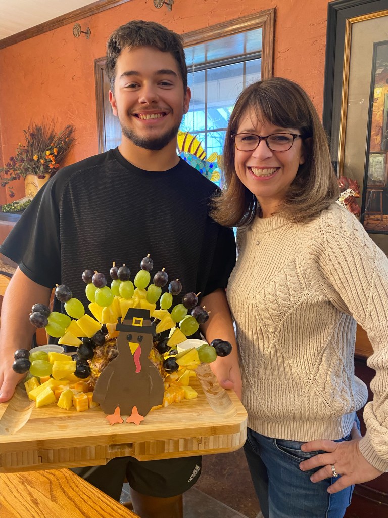 You’ll Need: Pineapple bottom cut flat on one side for the body Medium Length Skewers Turkey made of cardstock with a straw attached to the bottom to tuck under the pineapple body Grapes, Pineapple pieces, Strawberries for the feathers