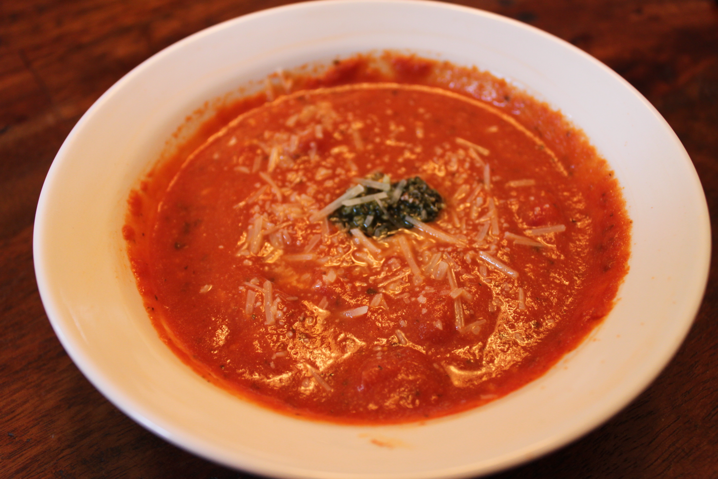 Combine equal parts of diced tomatoes and tomato sauce. I use Hunt’s Four Cheese. Heat. Add fresh or dried basil and oregano to taste. Add whipping cream until the soup turns light orange. Add Parmesan cheese to taste. May need a sprinkle of salt depending on tomato sauce base.