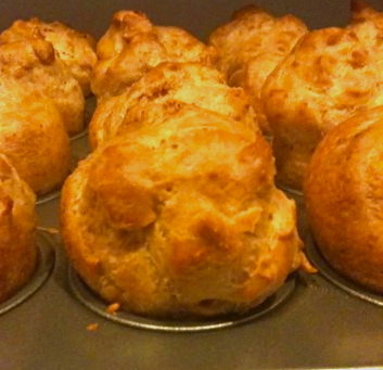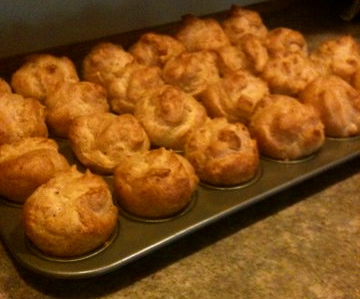 Puff: Heat water, butter and salt until mixture boils. Remove from heat. Vigorously stir in flour all at once until mixture forms a ball and leaves the sides of the pot. Add eggs one at a time, beating after each with a wooden spoon. Drop by spoonfuls into greased muffin pan or on a cookie sheet lined with parchment paper. Bake 400 40 minutes or until golden. Turn off oven and leave in and additional 15 minutes. Remove from oven and poke a small hole in each to let the moisture escape. Cool