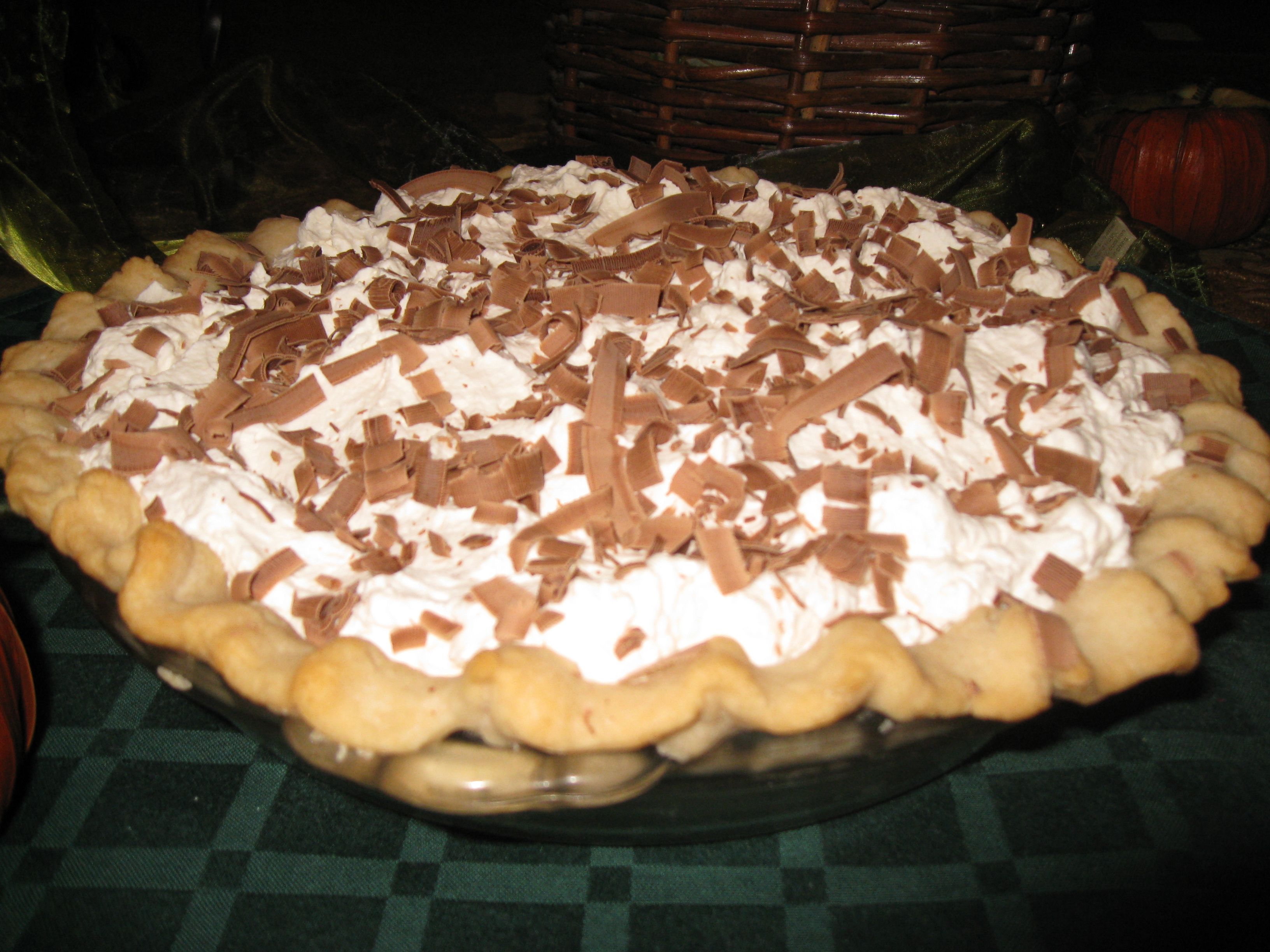 Top the whipped cream with chocolate curls made with a potato peeler and a Hershey’s candy bar at room temp.