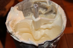 Mix eggs and sugar until light yellow. Add remaining ingredients. Fill container to fill line with whole milk. You need 3 bags of ice and rock salt. Mix until freezer stops, then cover with ice and towels and let sit until you serve.