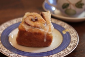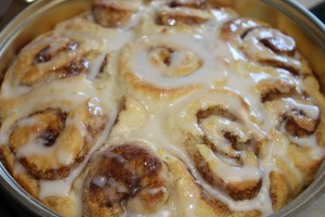2. For Cake: Coat two 9 inch cake pans with vegetable oil spray. Mix flour, baking powder, baking soda, cinnamon and salt together in a large bowl. In a smaller bowl, whisk sour cream, sugars, eggs, and melted butter together. Gently whisk the egg mixture into the flour mixture until it is smooth and well combined. Do not over mix.