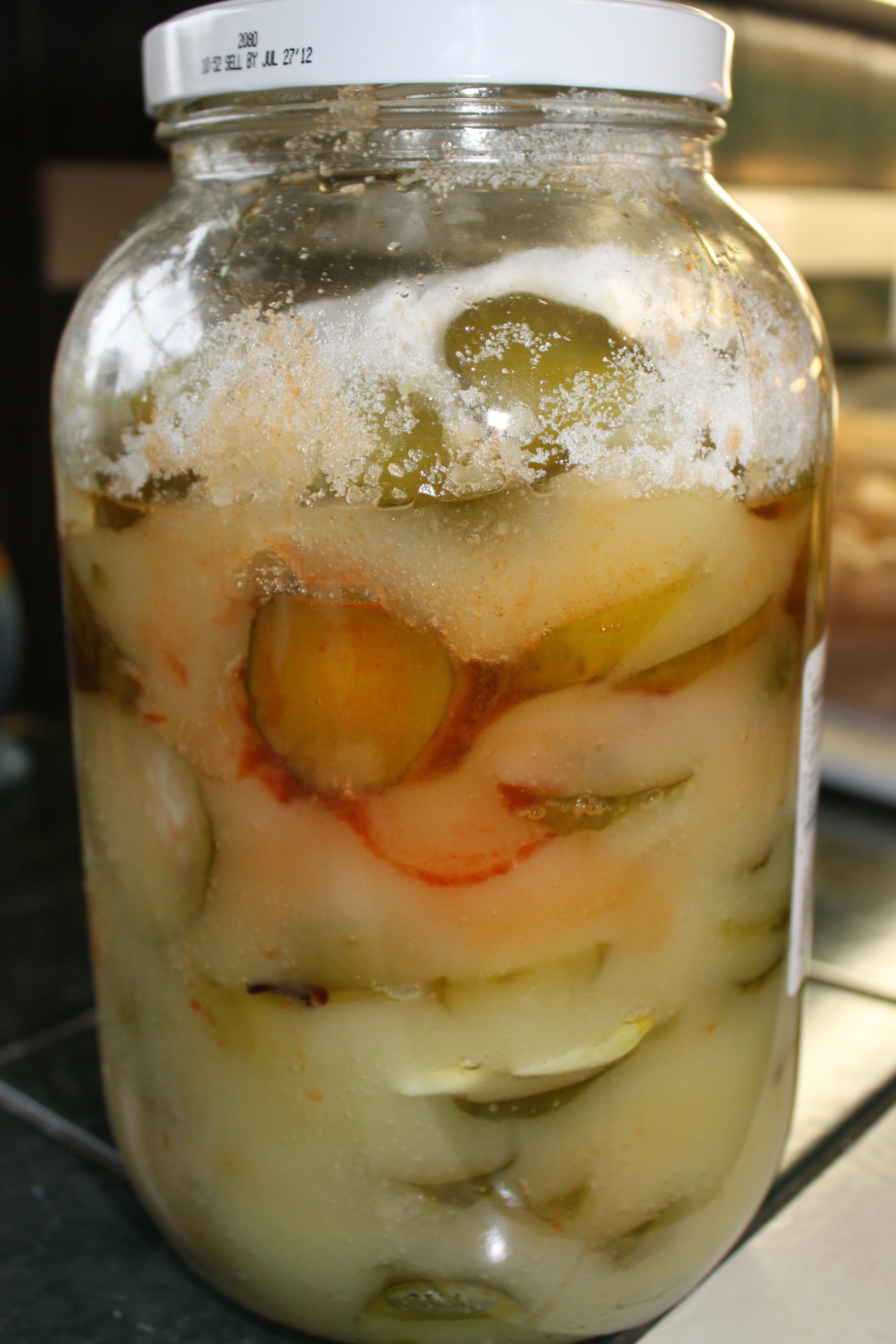 Pops loves to makes these for parties.  Everyone gobbles them up! With a whole bag of sugar and a whole bottle of Tabasco, they truly are sweet and spicy!  As they sit, the sugar pulls out all the juices still in the pickles, which makes them very crispy. Granny calls them Fire and Ice pickles.