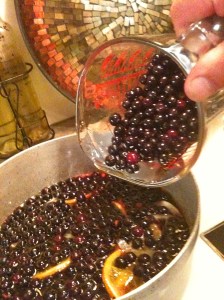 1.  Scrub the oranges and remove a slice from each end.  Cut oranges into quarters and remove any seeds.  Slice thinly.  Place in a non-reactive (meaning don’t use aluminum or copper) soup pot.  Pour 2 1/2 cups of water over the oranges and press down to release some of the juice. Cover the pot with a tea towel and set on the counter overnight. **Sometimes I also slice one lemon and added it to the mix.