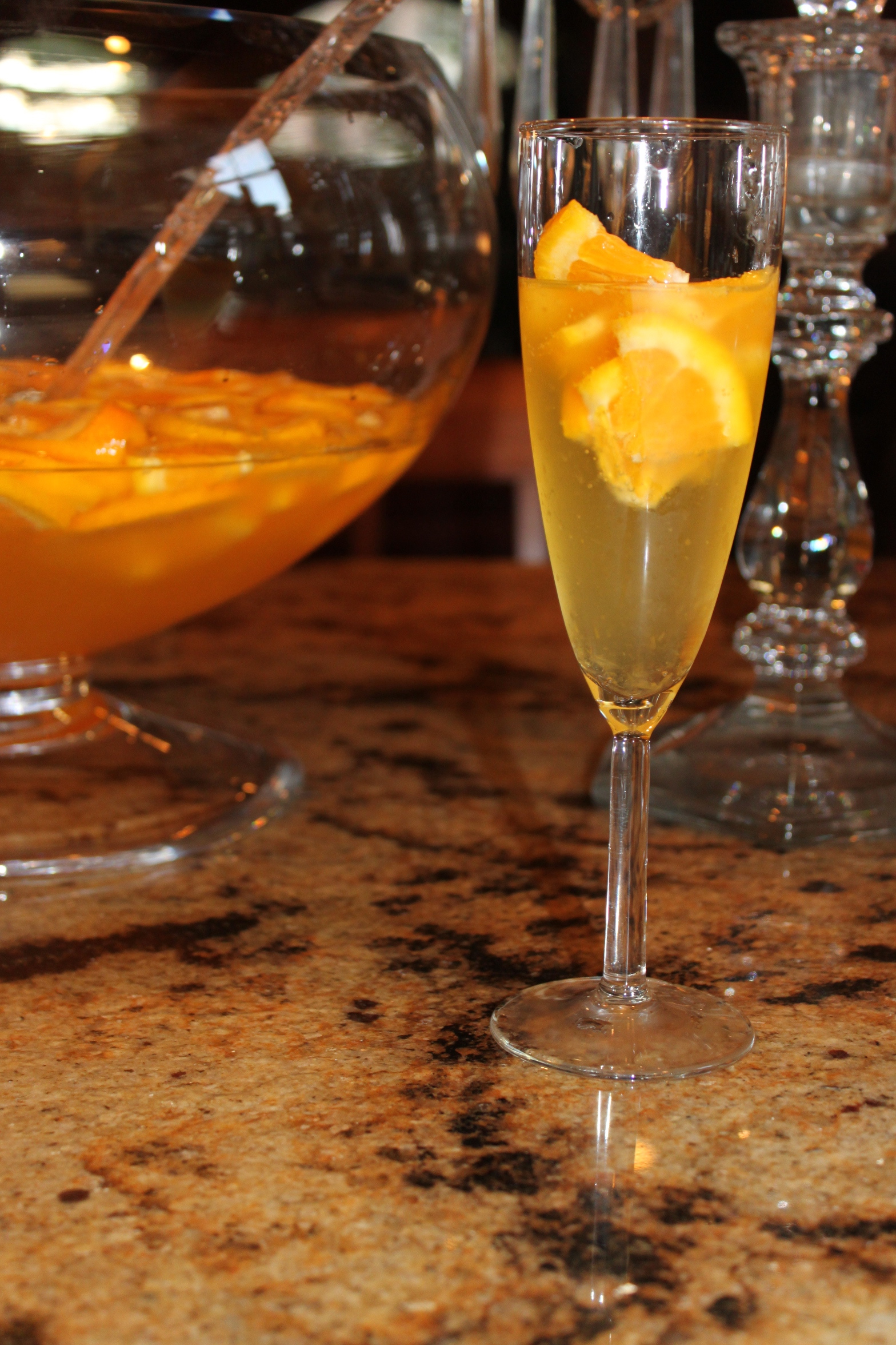 2. Right before guests arrive, pour chilled orange mixture into punch bowl and add two bottles of chilled champagne. Cheers!