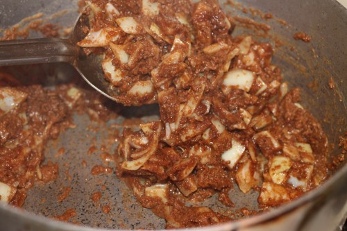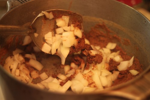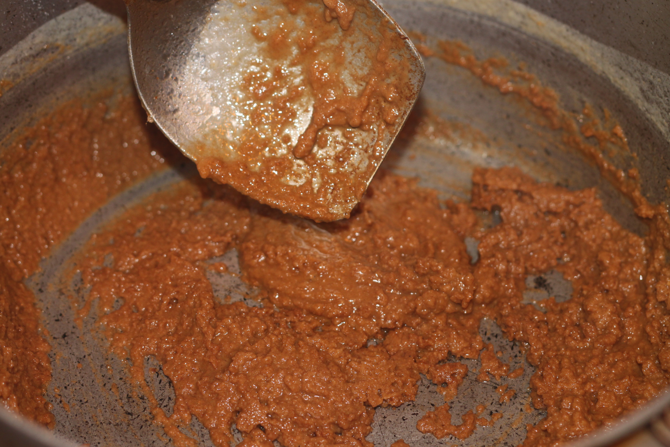 Mix 3/4 cup flour and 3/4 cup oil. Heat and stir constantly with a flat bottom spoon.