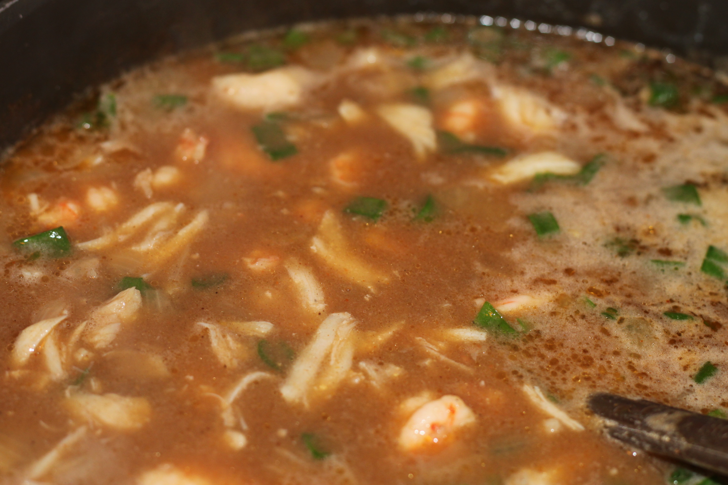 Add browned chicken and sausage remembering to add water to the bottom of the pan to remove bits of browned chicken. Simmer about an hour until chicken is falling off the bone. (Chicken breasts can be used, but you will miss the flavor that the bones add just like when you make homemade chicken soup.) Remove the chicken from the gumbo and discard the bones and skin. Return the chicken to the pot adding water depending on the desired thickness of the gumbo. Simmer, skimming off excess oil. Before serving, add chopped green onions.