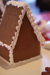 We also created a small short cardboard box for the inside.  It was about  inch high. We glued the sides onto it with icing and then piped the corners together. Tip: Do not make boxes ahead of time because each box will need to fit the unique size of your house.  Each piece of gingerbread is not exactly the same.