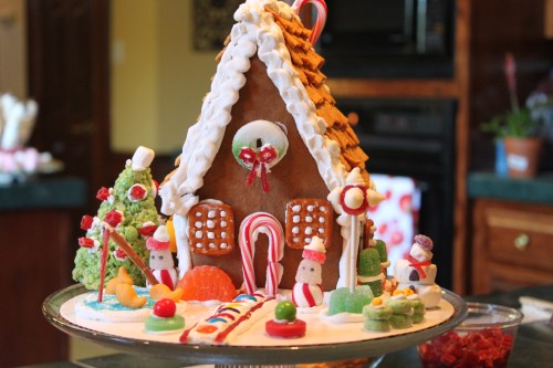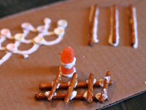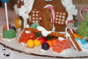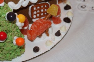 Each child was given a baggie of treats to begin the decorating process.  We started off creating things as a group and then released the kids to gather items from the candy buffet in clear plastic cups to create their own decorations.  We provided an example house, example ideas on a piece of cardboard, and printouts from websites for inspiration.