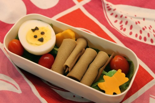 Here is an example of how to pack a bento box: line bottom with lettuce or spinach leaves, punch face out of nori (seaweed paper used in sushi rolls) and place on boiled egg half, roll slices of meat and thread onto long food pick, tuck in cherry tomatoes and cheddar slices cut into shapes.