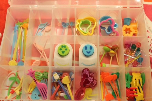 Collection of food picks, small forks, and nori punches are stored in a jewelry organizer.