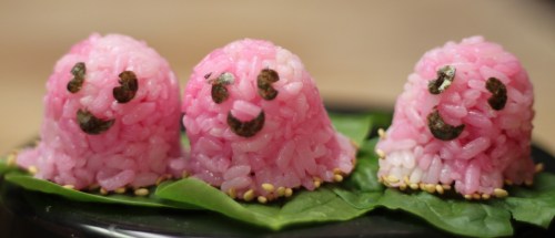 Molded sushi rice with nori punch faces. I colored the rice pink with pickled beet juice. They look like Pac-Man ghosts to me!