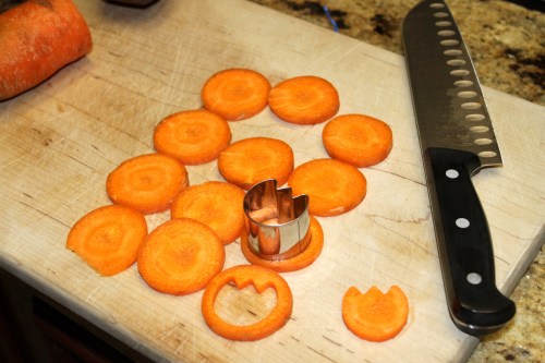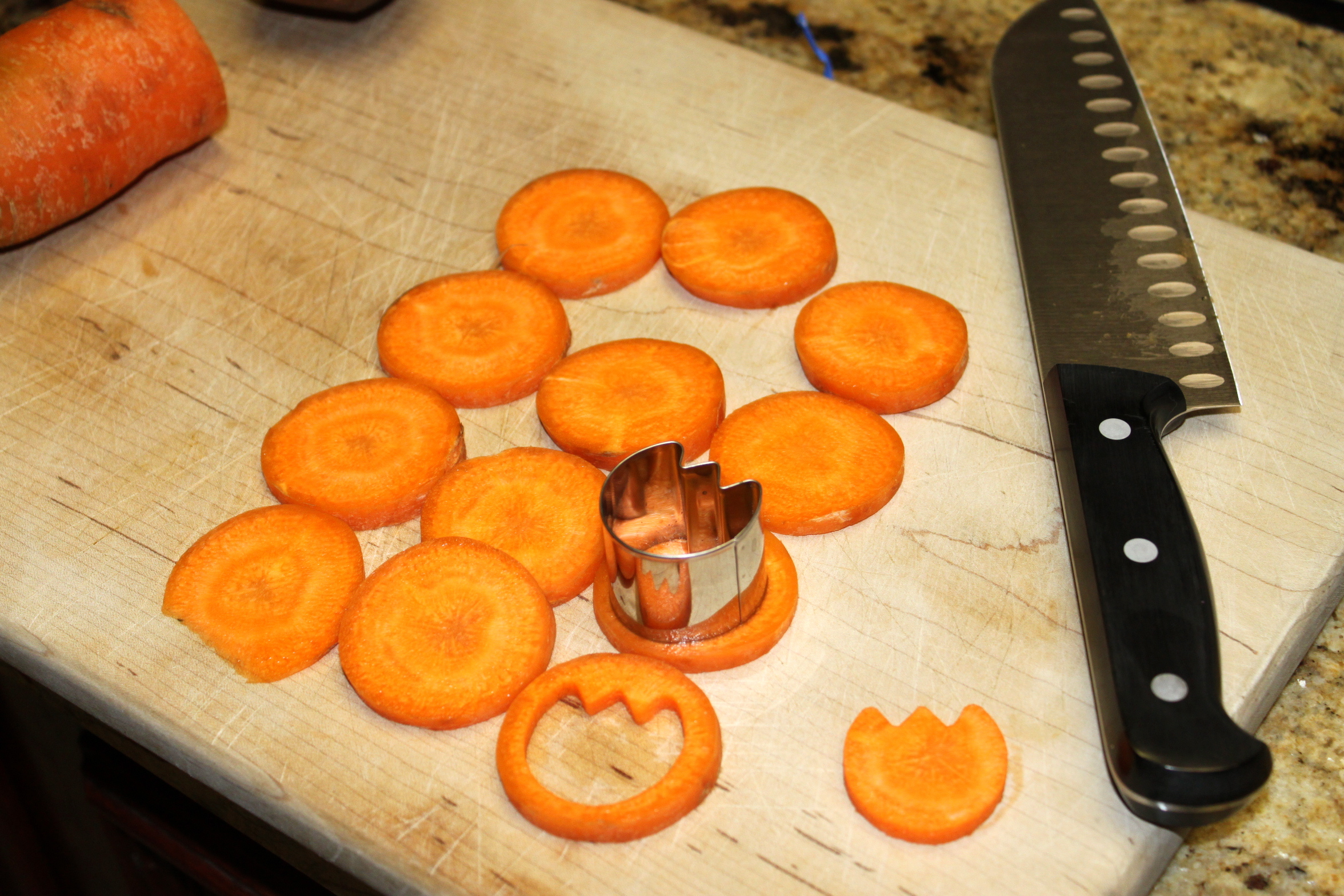 Find extra large carrots in Asian grocery stores. Slice without peeling and cut into shapes with small metal cookie cutters. Serve with ranch dip if desired. Here we cut flowers and added celery sticks for stems or grass.