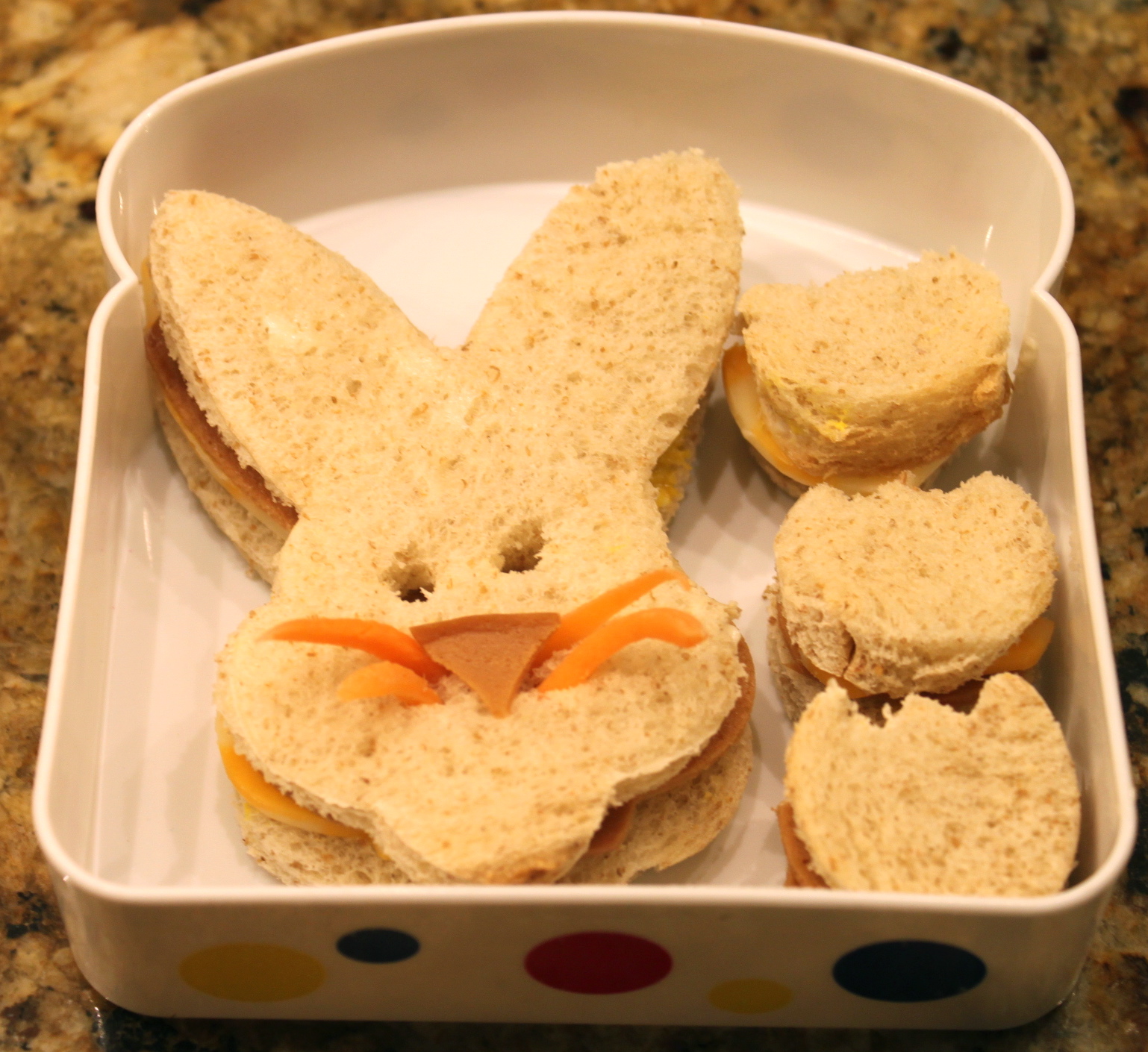 Square sandwich boxes are also great to pack cute lunches. Cut sandwiches into shapes and decorate the top with cheese, cold cuts, dried fruit or veggies. Here I've cut out the bunny's eyes with a straw and attached carrots and veggie bologna with mayo. Peanut butter can also be used as a glue.