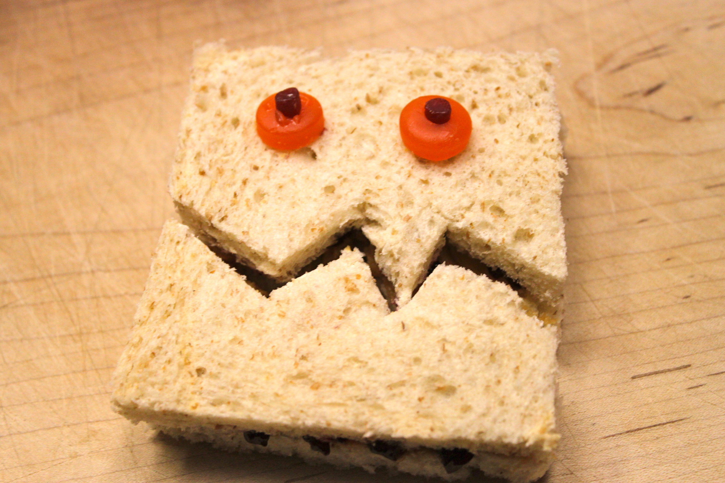 Square sandwich boxes are also great to pack cute lunches. Cut sandwiches into shapes and decorate the top with cheese, cold cuts, dried fruit or veggies. Here I've cut out the bunny's eyes with a straw and attached carrots and veggie bologna with mayo. Peanut butter can also be used as a glue.